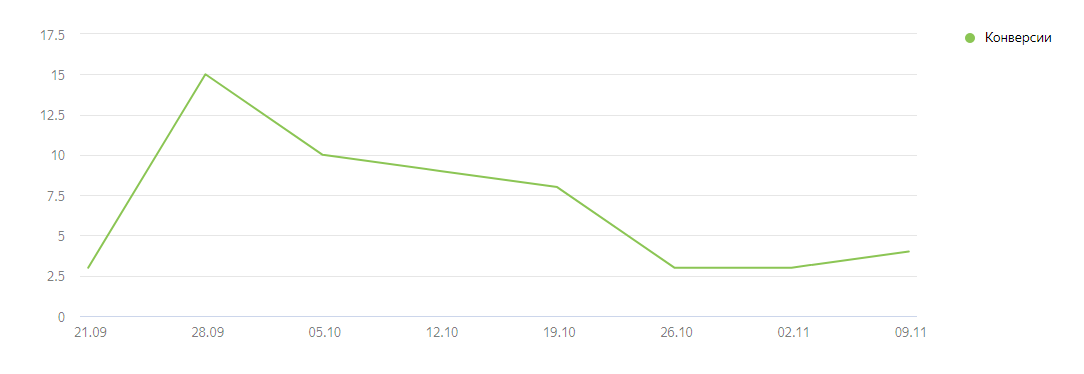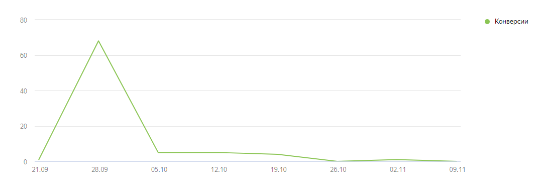 В справке Яндекса по новой стратегии написано, что для успешного теста необходимо 10 конверсий в неделю. У нас за время теста было максимум 8 конверсий.
