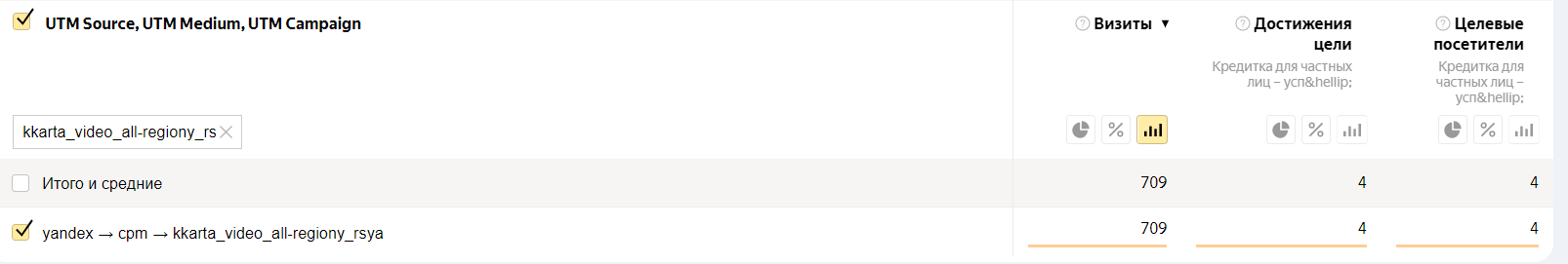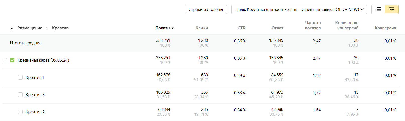 2. Заведение рекламных кампаний в Метрике для Медийной рекламы для дальнейшего оценивания post-view конверсий. В качестве приоритетной цели поставили отправку заполненной формы заявок по продукту Кредитная карта.
