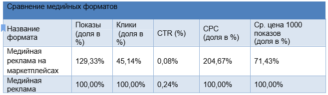 По итогу работы этой медийной рекламной кампании сравнили показатели с другим медийным форматом — Медийная реклама на маркетплейсах. Где брали долю в %, медийную рекламную кампанию ставили как точку отсчета и там ставили 100%.