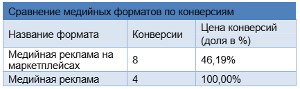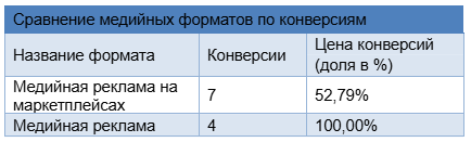 Если сравнивать прямые конверсии по медийной рекламе и медийной рекламе на маркетплейсах, то по медийной рекламе получили меньше конверсий по большей цене.