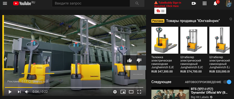 Мы решили протестировать лидирующий сервис по просмотру видео в России — YouTube. Клиент предоставил отличный видеоролик по самому популярному направлению электрической техники — электрические штабелеры.