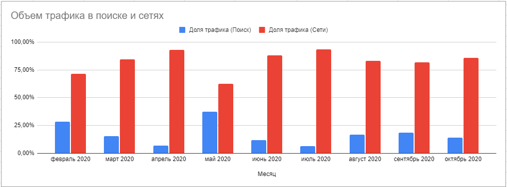 Количество обращений из сетей в общей доле всех лидов исчислялось в пределах 20-40%.