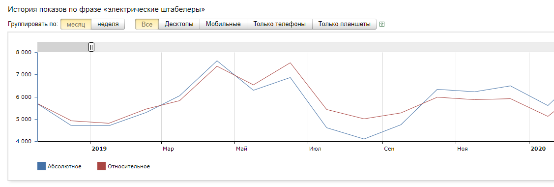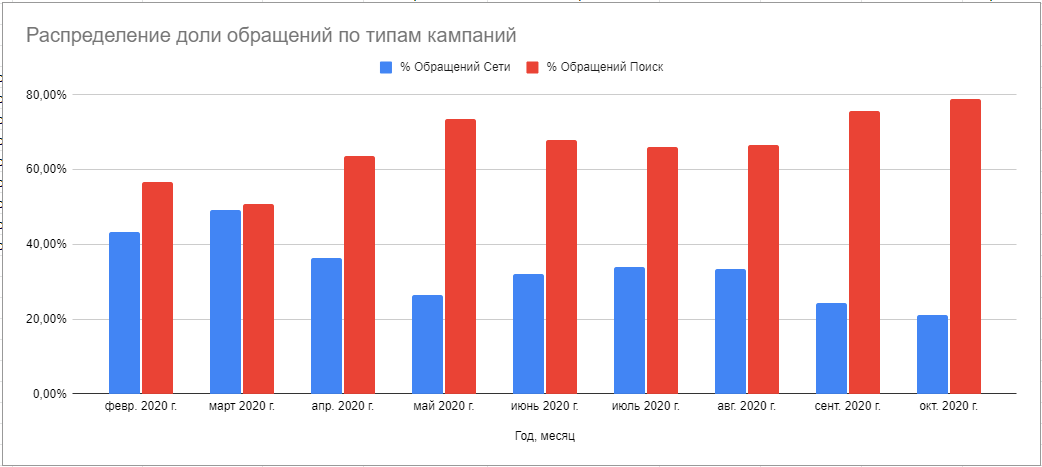 Поисковый запрос для каждой категории товаров и услуг отличался. Спрогнозировать эффективное распределение и расход рекламного бюджета в нашем случае оказалось невозможно. Только результаты работы первого периода — 2019 года, позволили перераспределить бюджеты так, чтобы обеспечить стабильный поток входящих обращений по каждому направлению в 2020 году.