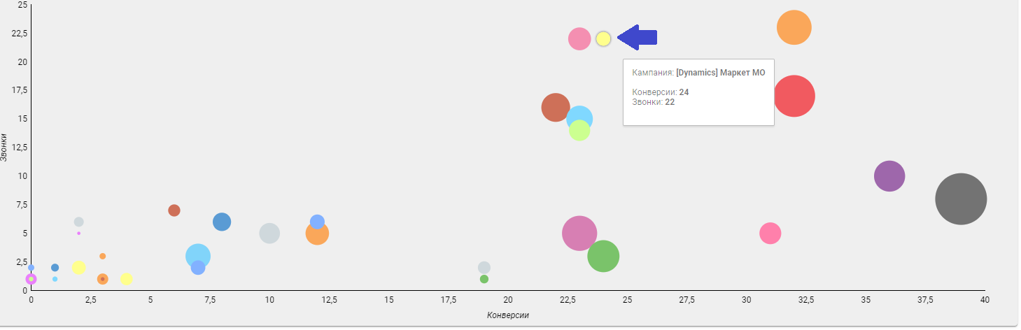 На пузырьковой диаграмме легко оценить эффективность такой кампании при продвижении Jungheinrich. Размер пузырька определяет, какой бюджет на нее был потрачен, а дальность расположения от каждой из осей X и Y обозначает эффективность (количество набранных звонков и обращений).