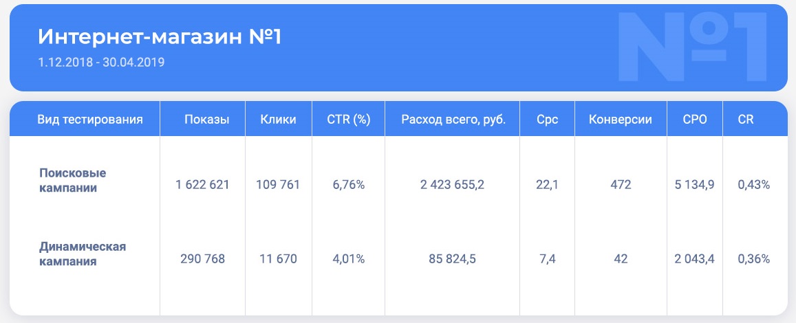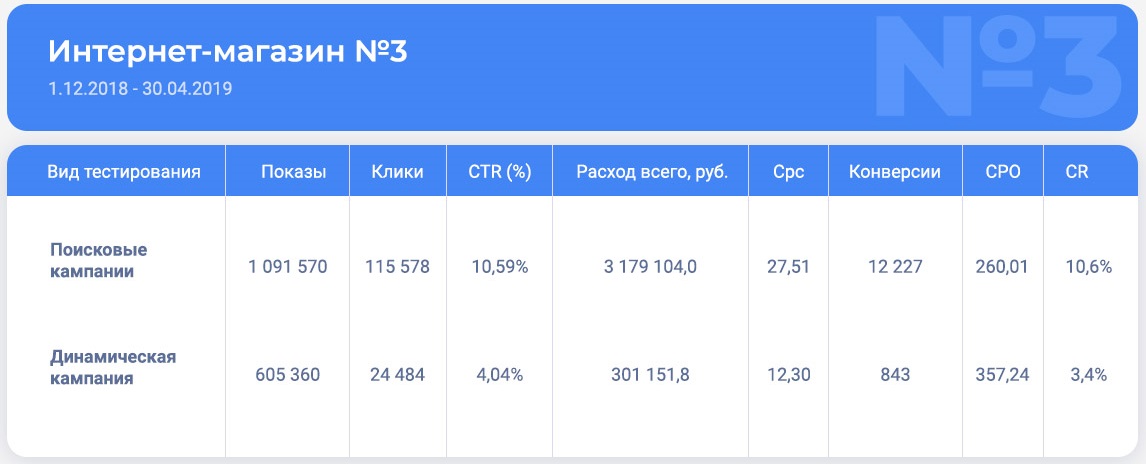 - у двух из трех клиентов цена за конверсию дороже, но динамические объявления привлекают дополнительные заказы, укладываясь в рамки KPI.