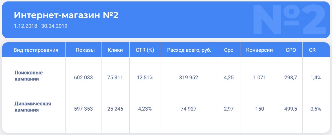 Итог: Товарная галерея принесла всего 7% конверсий. Целевое KPI: CPO < 600 руб., динамические объявления укладываются в KPI клиента. Здесь мы тестировали динамические объявления только на части категорий и с ограниченным бюджетом. Поэтому возможен рост за счет и ассортимента.
