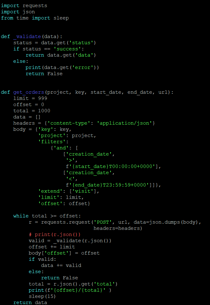 Перейдем к наиболее интересному — к механике передачи данных. У Roistat есть свой API. При помощи простой функции на языке Python легко получить данные по лидам, сделкам и визитам.