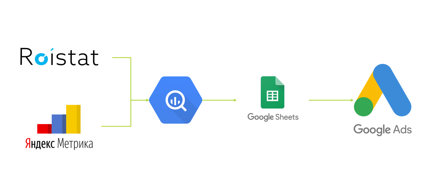 Данные о заказах из Roistat в предобработнном виде мы загружаем в BigQuery. Туда же идет экспорт из Logs API Метрики. В облаке мы сопоставляем по clientID заказ с gclid визита. После сопоставления достаточно импортировать данные в Google Sheets, подключить таблицу к аккаунту Ads и настроить регулярное обновление всей цепочки. Данные начнут в автоматическом режиме попадать в аккаунт.