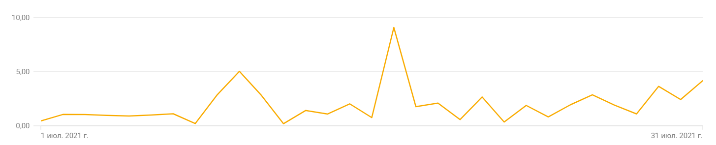 А для чего все было сделано? Торговая кампания оптимизируется по марже несколько недель. Ниже временной ряд из Ads «Ценность конверсии/Стоимость» с 1 по 31 июля. Первые две недели проходило обучение стратегии с наслоением конверсий, которые зарегистрированы в Google Ads до и после переключения конверсии в аккаунте.