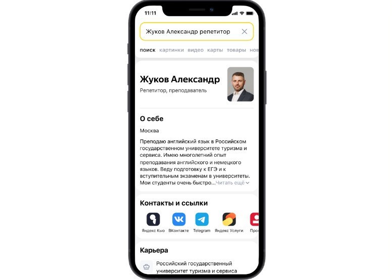 Яндекс запустил бета-тестирование нового сервиса Публичный профиль. Это онлайн-визитка в поиске Яндекса, которую смогут найти другие пользователи, в том числе потенциальные работодатели, если введут в поисковую строку имя, фамилию человека и его профессию.