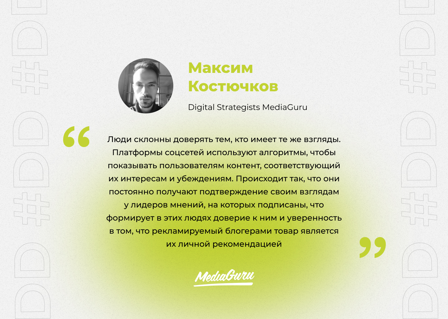 Это создает фильтр, в котором люди видят только тот контент, с которым они согласны, и редко встречают то, что бросает вызов их убеждениям. Они видят картину, которая более или менее соответствует их картине мира. Происходит так, что они постоянно получают подтверждение своим взглядам у лидеров мнений, на которых подписаны, что формирует в этих людях доверие к ним и уверенность в том, что рекламируемый блогерами товар является их личной рекомендацией, а не рекламой за деньги, как в других рекламных каналах».