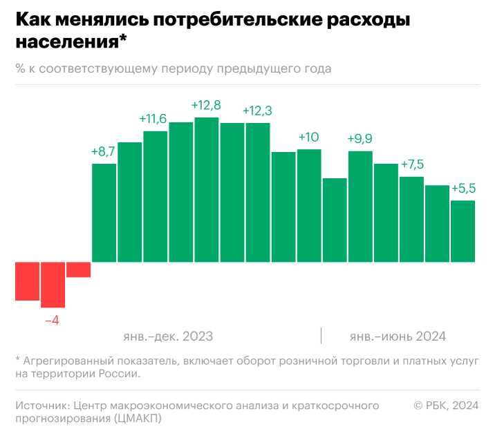 Минэкономразвития оценивает потребительскую активность на основе показателя «суммарный оборот». Он учитывает объемы розничной торговли, оборота общепита и платных услуг россиянам. Постепенное замедление фиксируется с марта. Тогда показатель составил 8,5%, в апреле он сократился до 7,3%, в мае достиг 6,6%.