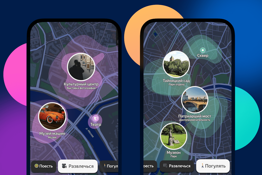 В «Идеях» появились новые рубрики «Развлечься» и «Погулять». Нажав на кнопку «Развлечься», пользователи увидят на карте места с развлечениями, которые могут им понравиться, например, концертные залы, аквапарки и клубы.