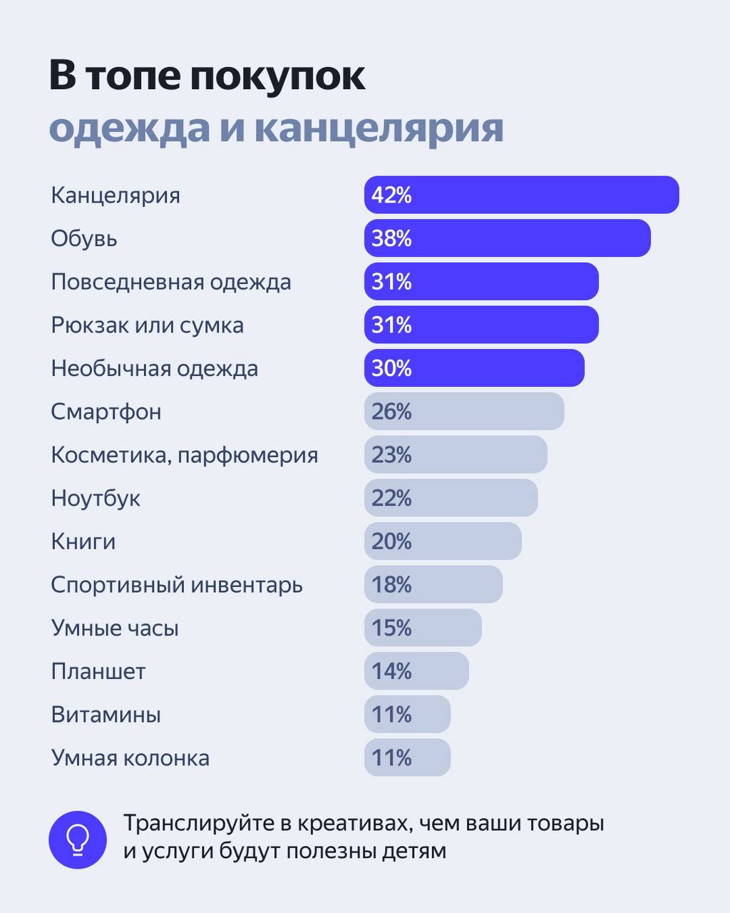 • в топе покупок канцелярия (42%), обувь (38%) и одежда (31%);