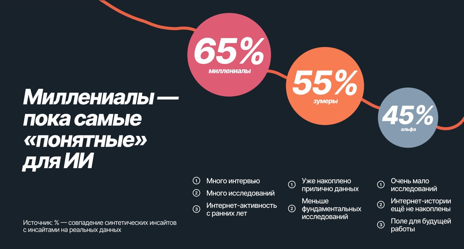 Компания представила проект Synth — виртуальных участников исследований, обученных на данных российской аудитории. Наибольшее совпадение с реальными людьми показали миллениалы (65%), затем зумеры (55%) и поколение альфа (45%). Технология использует интервью, охватывающие разные этапы жизни, ценности и потребительские привычки россиян. ИИ-респонденты могут ускорить получение данных для принятия решений.