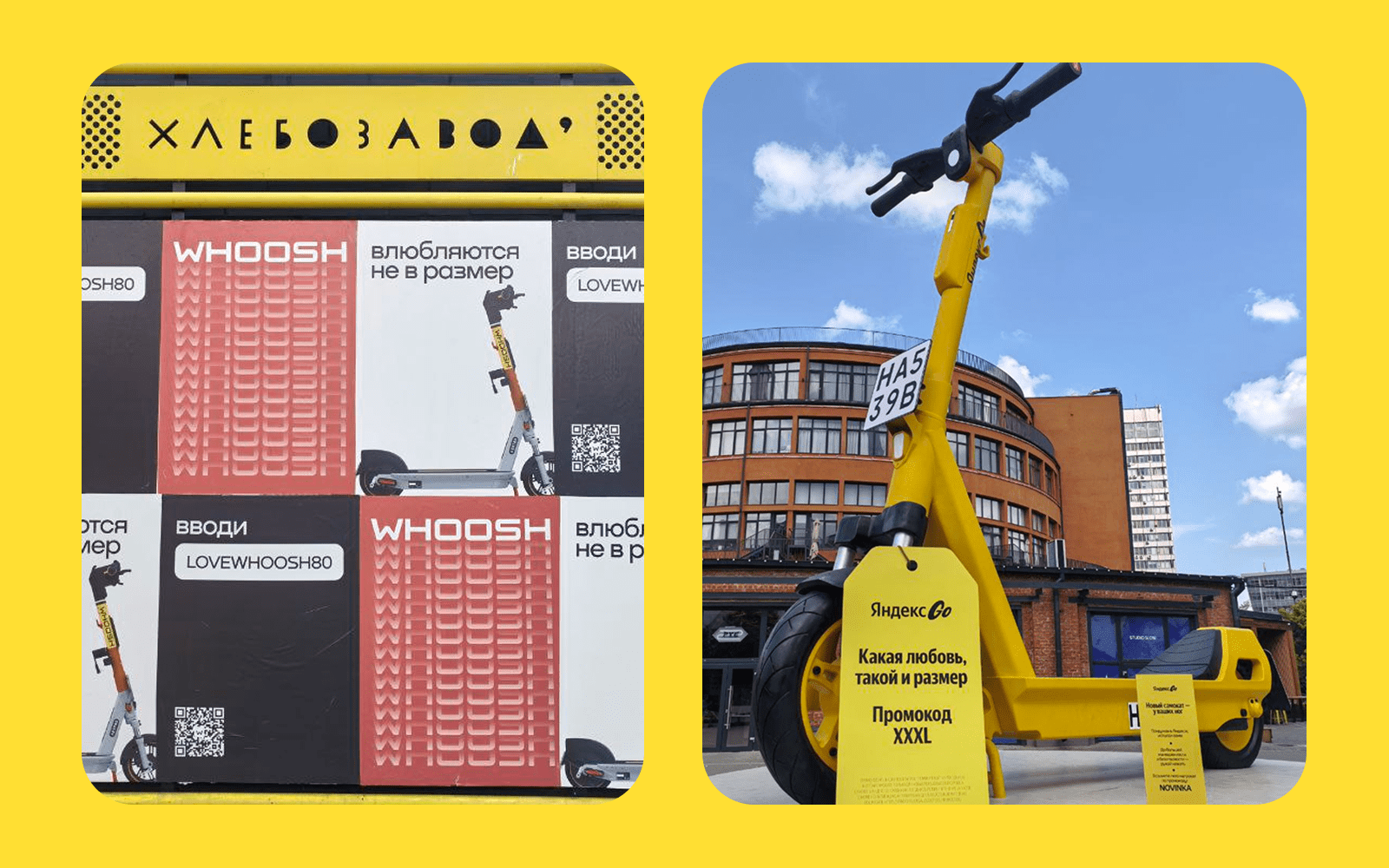 На «Хлебозаводе №9» в Москве Яндекс Go установил гигантский девятиметровый самокат — как арт-объект и рекламу в одном. В ответ Whoosh разместил рядом плакаты с фразой: «Влюбляются не в размер». Но Яндекс Go не остался в долгу и добавил подпись: «Какая любовь, такой и размер». Пользователи соцсетей оценили креативную «битву» — троллинг брендов напомнил им старые рекламные войны McDonald’s и Burger King.