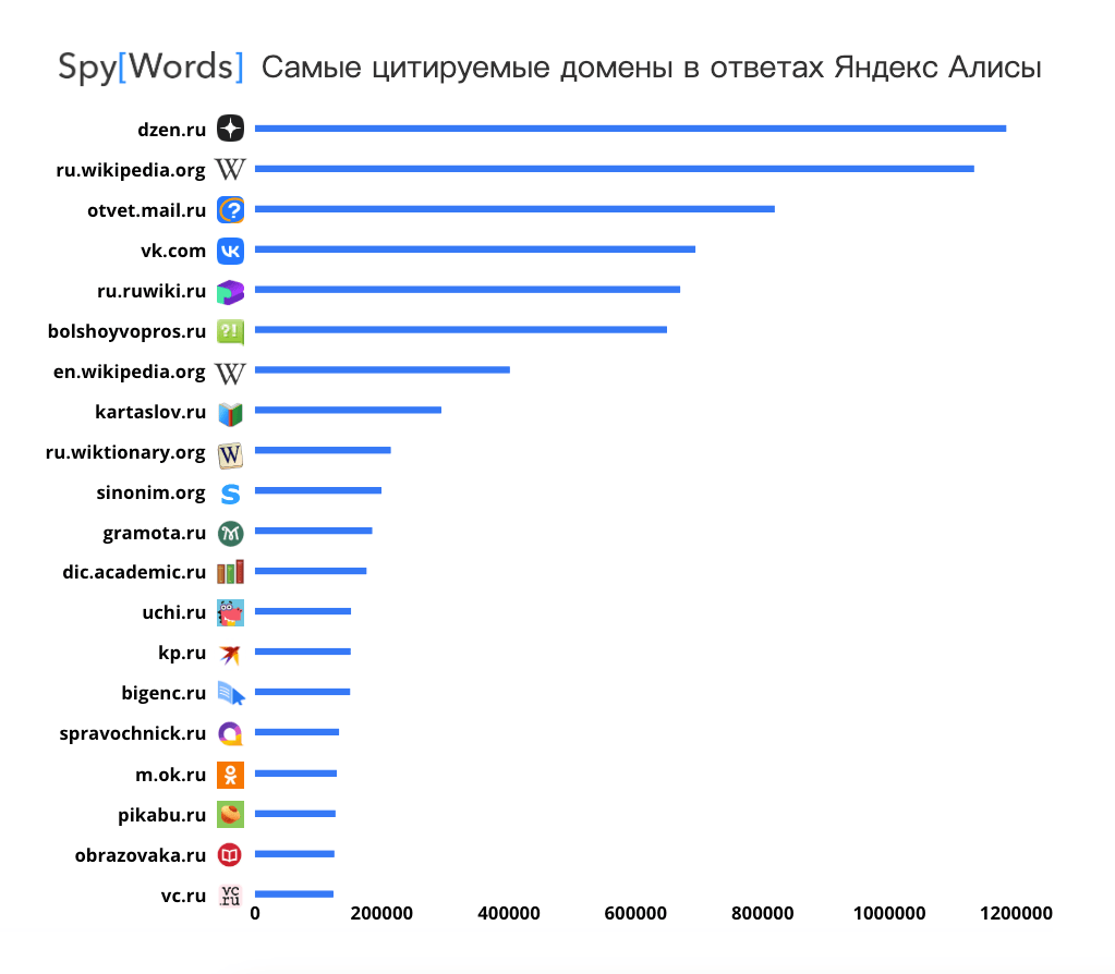 Аналитики Spywords выяснили, какие сайты чаще всего цитируются в нейропоиске Яндекса. Первое место занял Дзен (1,8 млн цитирований), за ним — Википедия и Ответы Mail. В топ также вошли VK и ruwiki.ru. Эксперты отмечают, что ИИ все чаще ссылается не только на справочные ресурсы, но и на пользовательский контент.