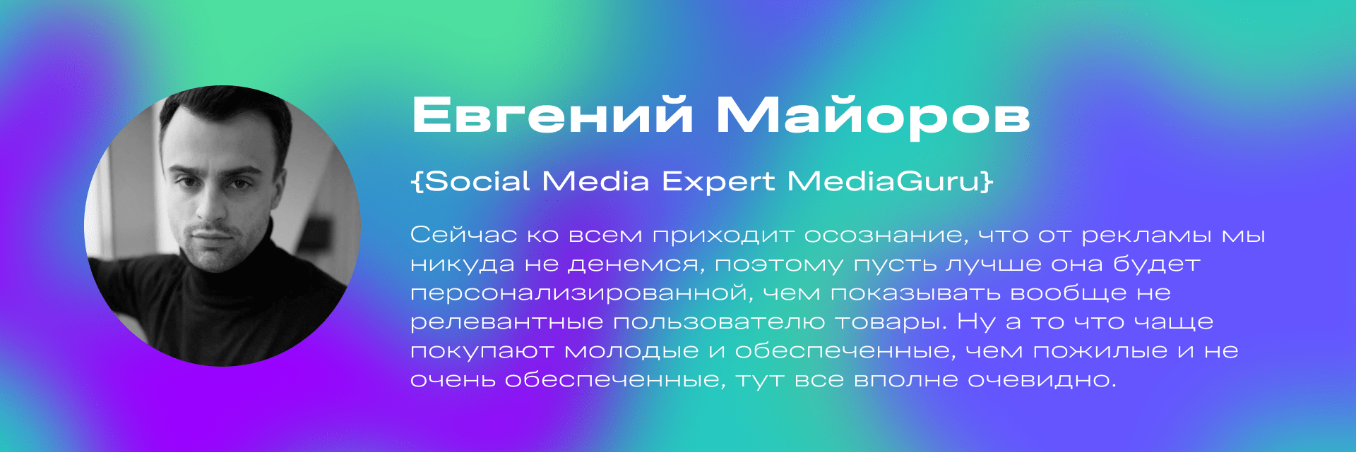 Сейчас всем становится понятно, что от рекламы никуда не деться, поэтому пусть лучше она будет персонализированной, чем совсем нерелевантной. А то, что чаще покупают молодые и обеспеченные, чем пожилые и малообеспеченные, — вполне очевидно.