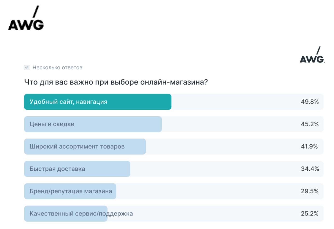 ИТ-интегратор AWG провел опрос* среди пользователей онлайн-магазинов и маркетплейсов. 46% респондентов делают заказы только в случае необходимости, а главным фактором при выборе магазина назвали удобный сайт и навигацию (50%). Также важны цены и скидки (45%) и широкий ассортимент (42%).