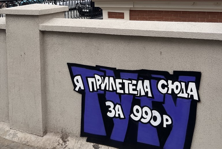 Сервис «Туту» запустил кампанию «Билеты и отели за 990 ₽» с провокационным креативом — фейковыми граффити в туристических местах. Надписи «Я прилетела сюда за 990 ₽» появлялись на временных панелях из ДСП возле известных достопримечательностей. Пользователи соцсетей обсуждали, вандализм это или реклама. В итоге выяснилось, что стены не пострадали, а «граффити» были частью задумки — визуальной провокации, чтобы привлечь внимание к офферу.