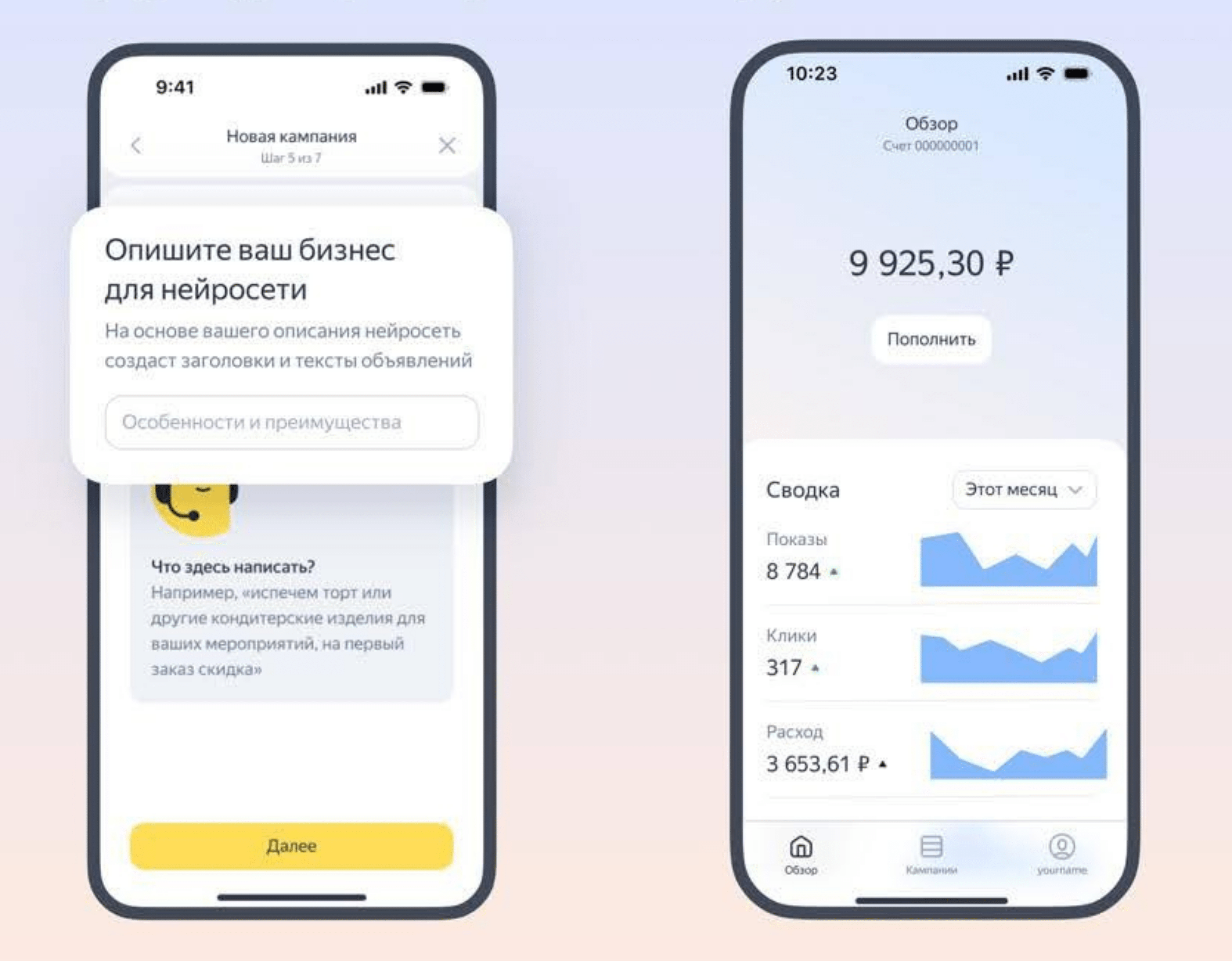 Теперь малый и средний бизнес может запускать и управлять рекламой через приложение Яндекс Директ. Рекламу можно настроить даже без сайта — достаточно указать контакты или выбрать бизнес из Яндекс Карт. Система сама создает объявления и настраивает кампанию.