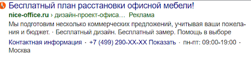 Компания Nice-office делает дизайн-макет интерьера в подарок. Поэтому мы решили протестировать аудиторию пользователей, которые интересуются дизайном офиса и создали новую РК с показами на поиске. В качестве УТП предложили получить макет дизайна с расстановкой мебели из ассортимента nice-office.ru.