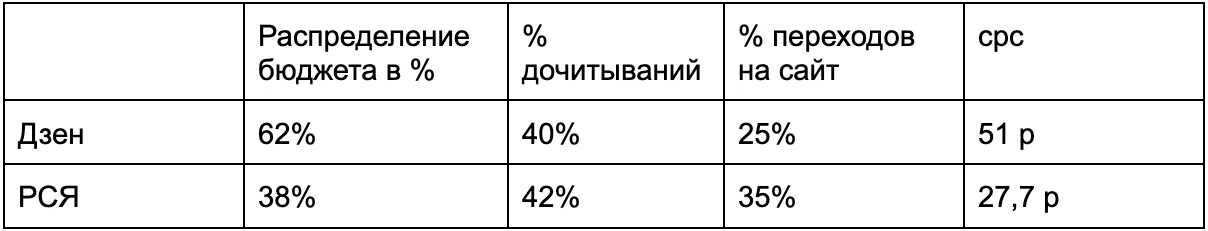 Трафик из РСЯ показывает результаты не хуже, чем из Дзена. Опасения «люди в РСЯ не привыкли читать, а привыкли сразу переходить на сайт» пока не нашли подтверждения в наших РК ни в В2В, ни в В2С.