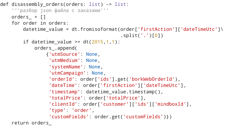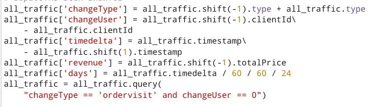 После создания датафреймов pandas отсортировали данные по clientID и timestamp для удобства последующей обработки. Нужно было построить цепочки для каждого пользователя. За цепочку принята последовательность визитов  пользователя на сайт: от первого посещения до совершения покупки и дальнейшие визиты до совершения следующей покупки. При этом везде указан источник трафика.