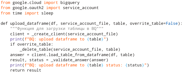 В качестве конечного пункта выбран дашборд в Google Data Studio (Студия данных). Данные загрузили в Big Query, чтобы было удобнее работать. Для этого использовался написанный ранее коннектор-обертка из официальной библиотеки Google для Python.